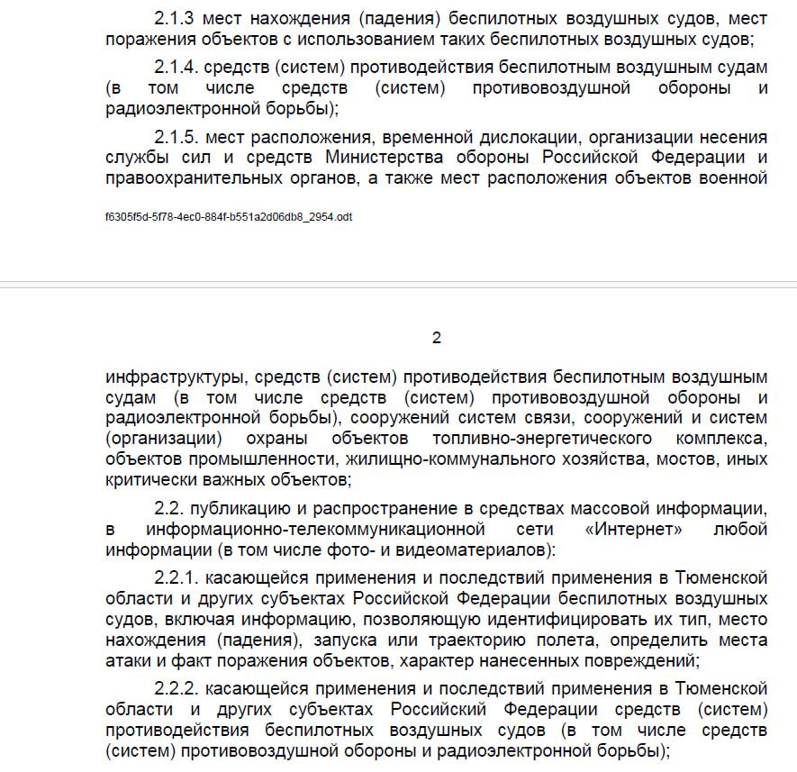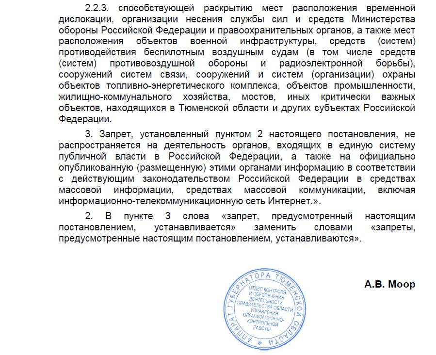 Как сообщили в информационном центре правительства области, под запрет также попадает публикация мест падения беспилотных судов. «В Тюменской области запрещается фотографирование, видео- и киносъемка: применения и последствий применения беспилотников, работы средств поражения и противодействия им, а также публиковать места падения судов», — уточнили в инфоцентре.