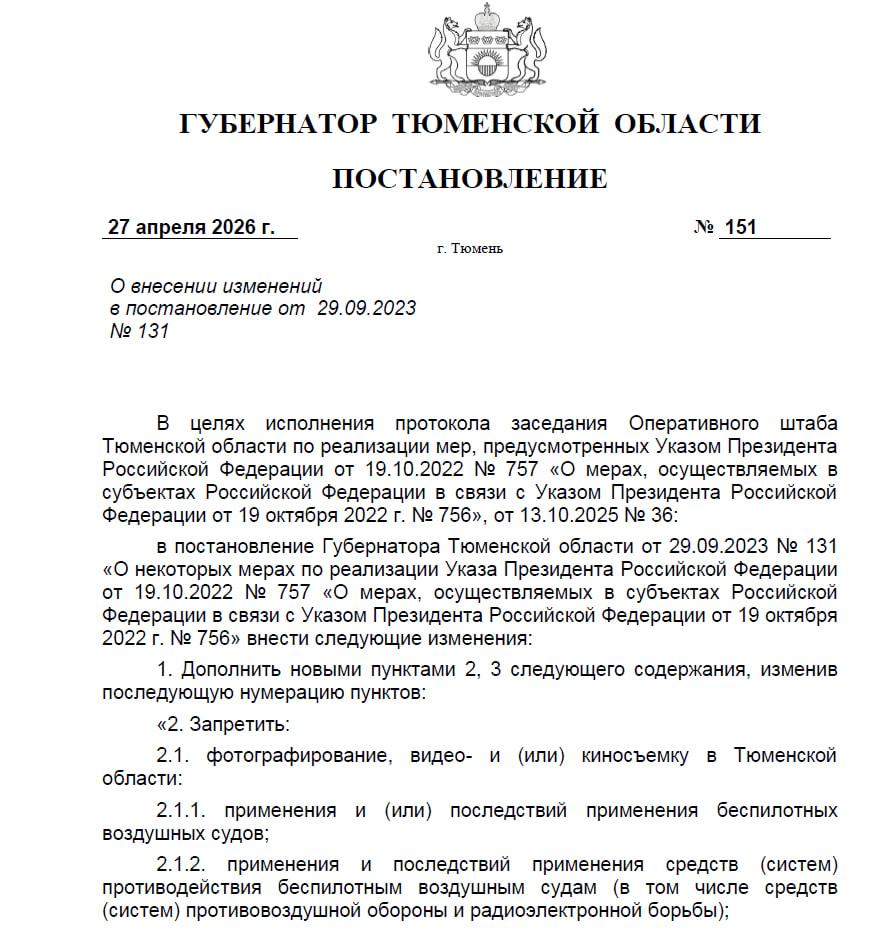 В Тюменской области ввели запрет на фотографирование, видеосъемку и киносъемку применения беспилотных летательных аппаратов, их последствий, а также работы средств поражения и противодействия им. Документ подписал глава региона Александр Моор.