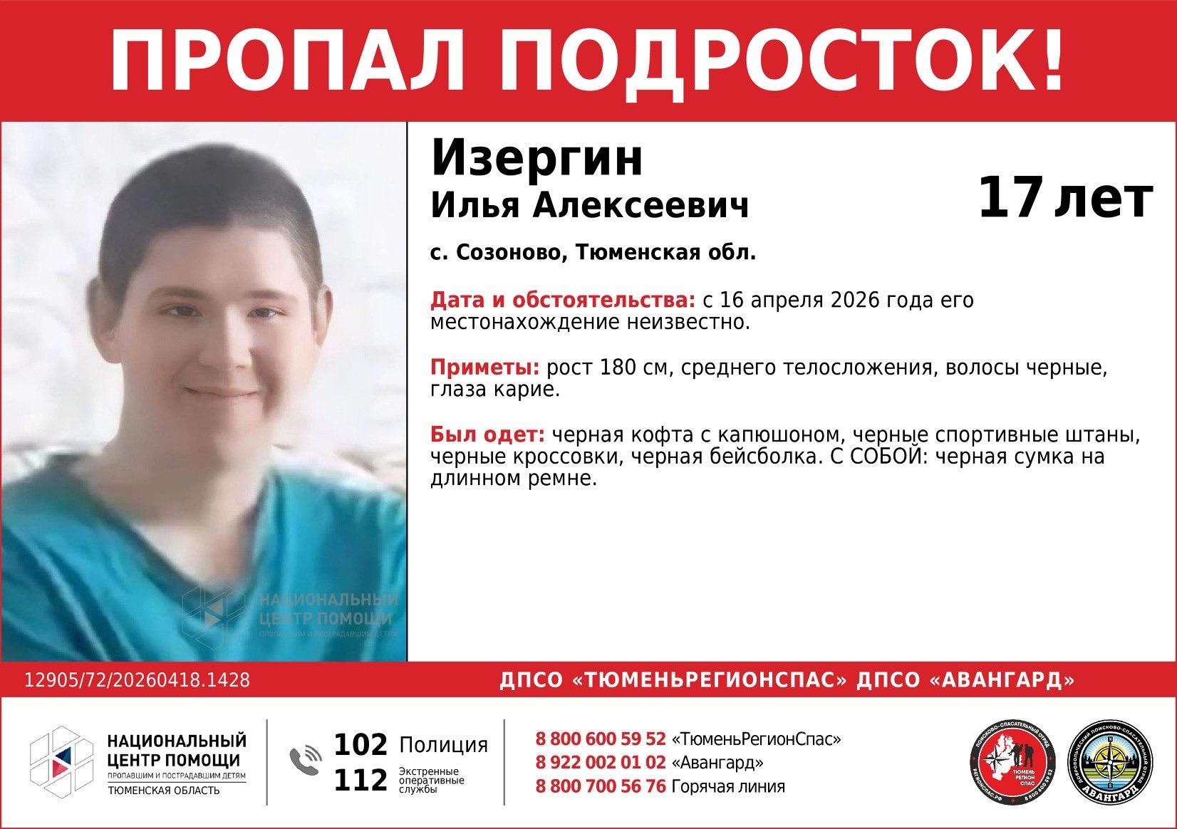 Поисковый отряд «РегионСпас» объявил о розыске 17-летнего Ильи Изергина, пропавшего в Тюменской области.